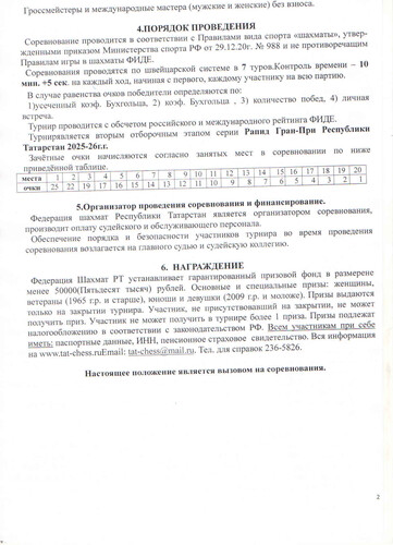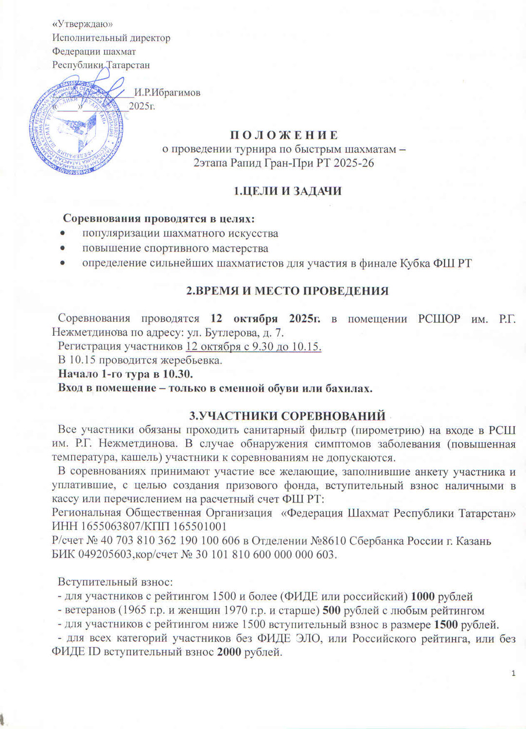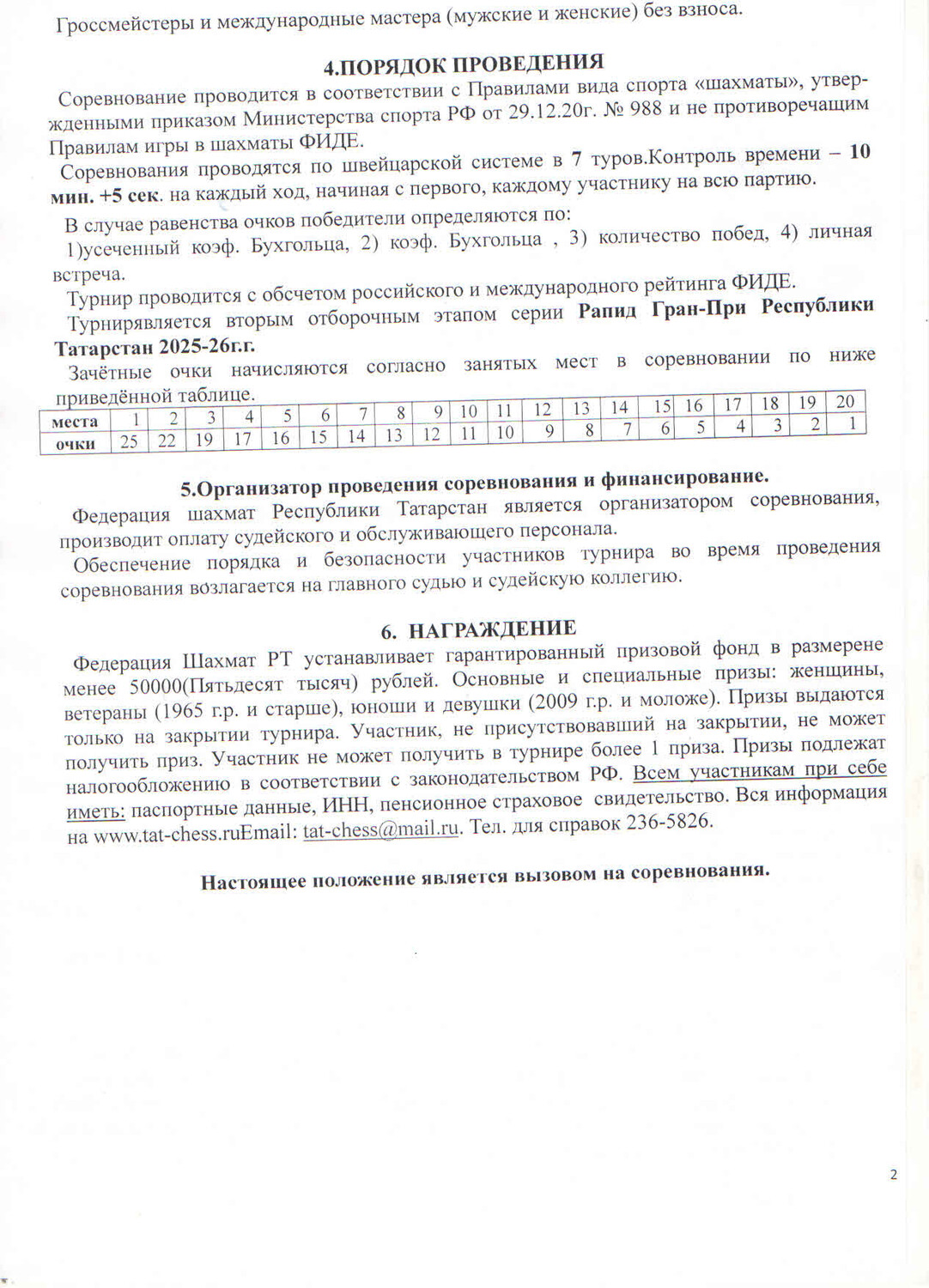 Победителем второго этапа Рапид Гран При Республики Татарстан стал международный мастер Алексей Иванов , на втором месте ММ Рамиль Файзрахманов, на третьем - Кирилл Ковалев. Среди юношей лучшим стал Руслан Минхайдаров, среди женщин - Алия Нагаева, среди ветеранов - мастер ФИДЕ Филипп Пираев. Соревнования проходили в РСШОР им.Р.Г. Нежметдинова 12 октября2025г