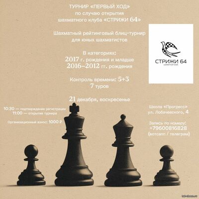 Блицтурнир по шахматам "Первый ход" по случаю открытия шахматного клуба "Стрижи" состоится 21 декабря. Адрес: Лобаческого, 4. Школа "Прогресс"