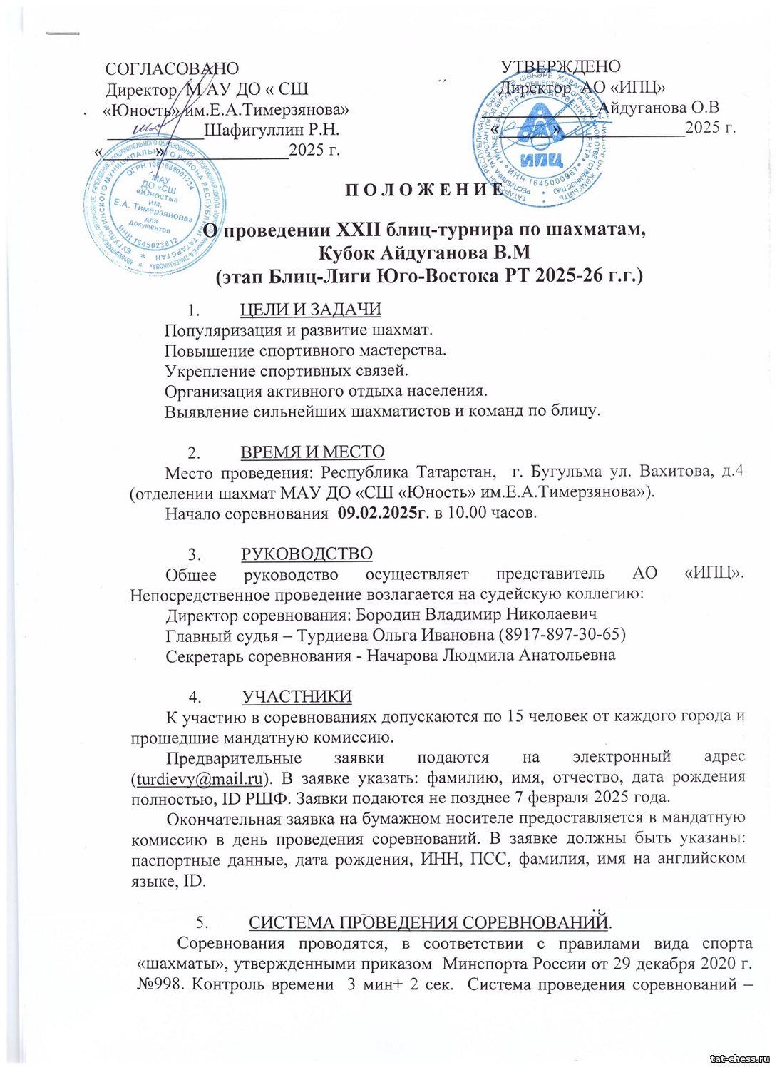 Кубок Айдуганова В.М. - Этап Блиц-Лиги Юго-Востока РТ 2025-2026 пройдет 9 февраля в Бугульме