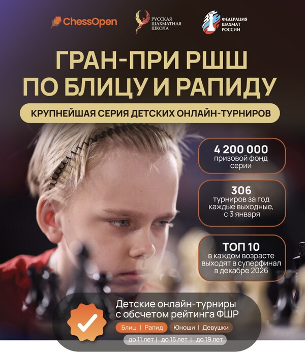 крупнейшая детская серия онлайн турниров по шахматам с обсчетом рейтинга ФШР и призовым фондом 4 200 000 рублей. У юных шахматистов впервые появилась возможность принимать участие в турнирах с обсчетом рейтинга ФШР в онлайн соревнованиях на российской игровой платформе.