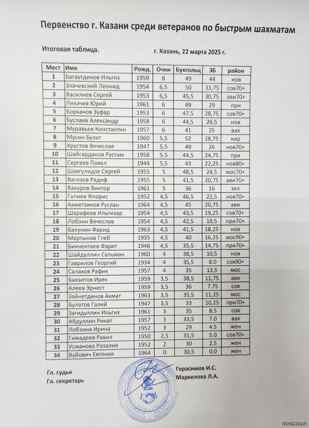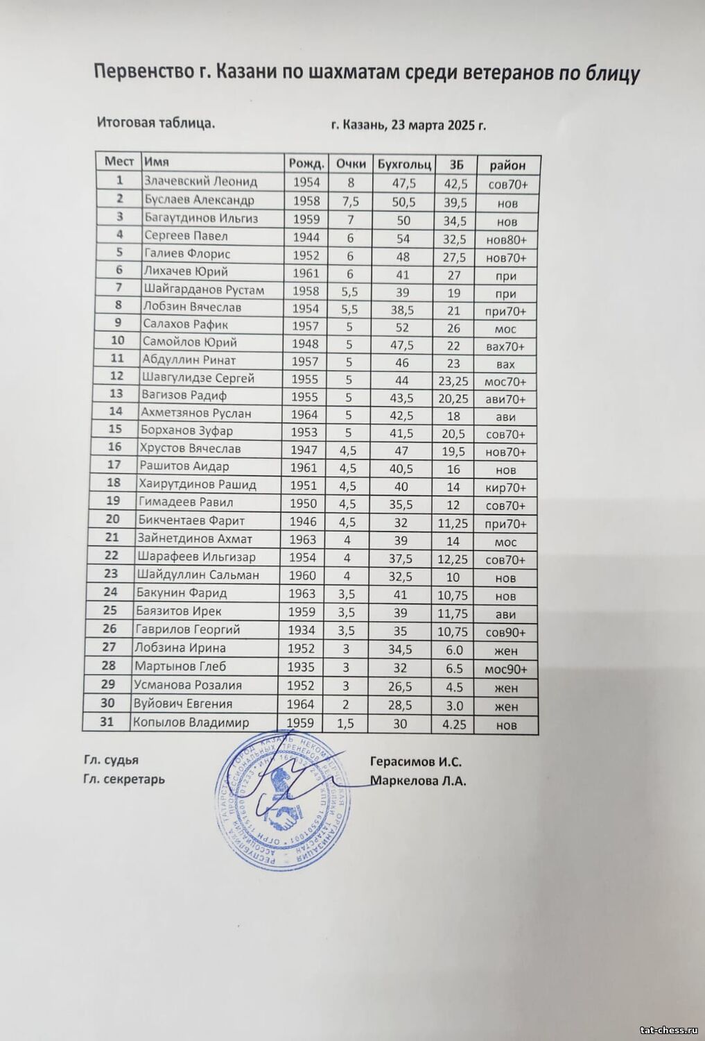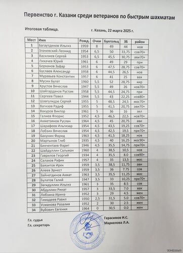 Первенство Казани по быстрым шахматам и блицу среди ветеранов проходило в клубе "Фианкетто" (ул.Сары Садыковой, 30) 22 и 23 марта 2025 г.