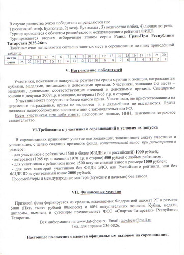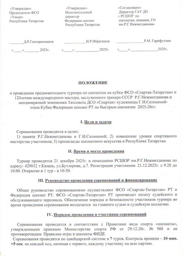 Предновогодний турнир на Кубки ФСО "Спартак-Татарстан" памяти Р.Г.Нежметдинова и Г.И.Сатониной - 3 этап Рапид Гран При Республики Татарстан состоялся 21 декабря в РСШОР им.Р.Г.Нежметдинова. Победители и призеры 1 место - Алексей Иванов, ММ 2 место- Рамиль Файзрахманов, ММ 3 место - Иван Арзамасов Среди женщин 1 место - Мия Винокурова 2 место- Софья Гарипова 3 место - Мадина Марданова Среди ветеранов 1 место - Леонид Злачевский 2 место - Ринат Гимадеев 3 место - Раиф Хасанов Среди юношей 1 место - Арслан Жураев 2 место - Руслан Закиров 3 место - Богдан Волынец