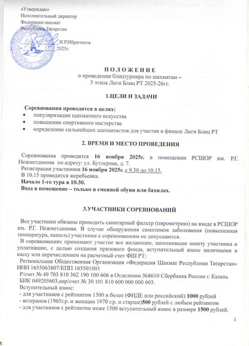 Регистрация на турнир с 9.30 до 10.15 Начало 1 тура - в 10.30 Регистрируйтесь в турнир заранее! - оплатите взнос согласно положению (по реквизитам ФШ РТ в положении) - пришлите на эл. почту tat-chess@mail.ru скан или фото квитанции, а также ФИО участника, дату рождения и номер учетной записи ФИДЕ или РШФ - в ответном письме мы вышлем подтверждение и включим вас в состав участников - после этого можно приходить сразу к первому туру в 10.30