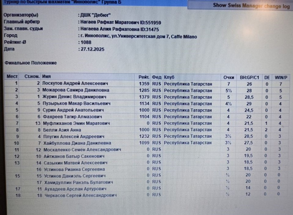 27 декабря 2025 г. в г.Иннополис ДШК «Дебют»совместно с Caffè Milano провели турнир по быстрым шахматам. В турнире приняли участие 34 участника с Иннополиса, Казани, Арска в двух возрастных группах.