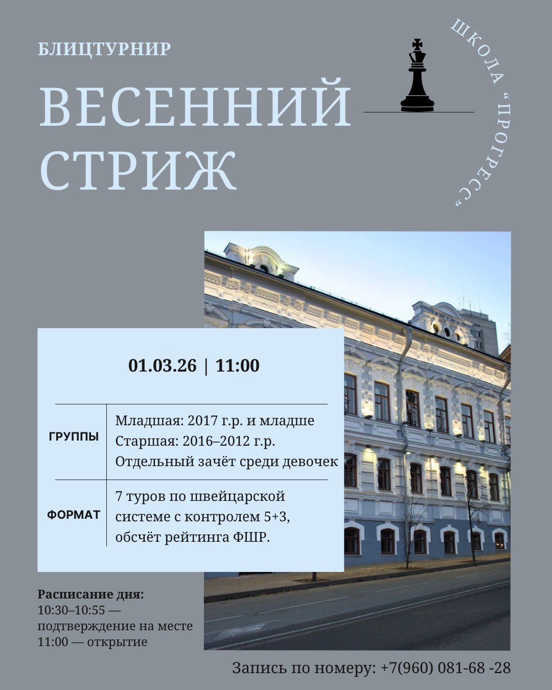 Блицтурнир шахматам "Весенний Стриж" состоится 1 марта в школе "Прогресс" (ул. Лобачевского,4)
