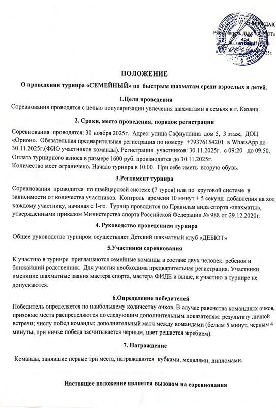 30 ноября 2025 года, в ДШК «ДЕБЮТ» прошел традиционный семейный турнир по быстрым шахматам. Приняло участие 17 команд. Поздравляем победителей!!! 🥇 Зверев Александр и Степан. 🥈 Черепов Дмитрий и Сергей 🥉 Маланин Егор и Глеб