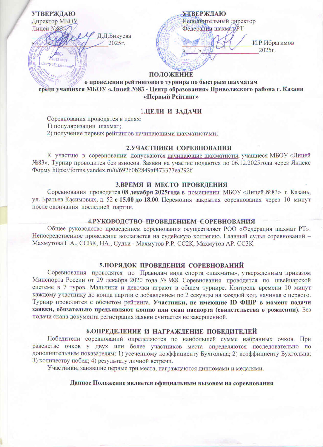 8 и 10 декабря 2025 года в МБОУ «Лицей №83 - Центр образования» Приволжского района г. Казани состоялись рейтинговые турниры по быстрым шахматам, организованные Федерацией шахмат РТ. В соревновании приняли участие 47 учеников 83 Лицея.