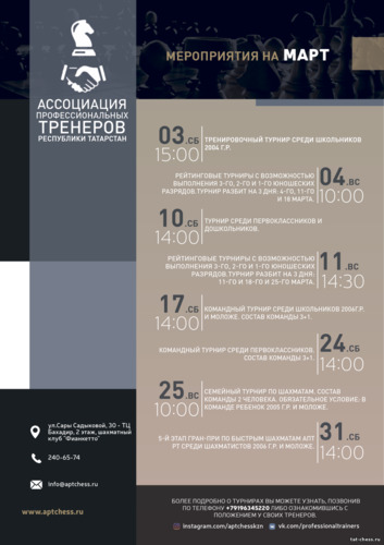 В пятницу в 18:00 мы ждем шахматистов с рейтингом 1250 и выше на мастер-классе с международным гроссмейстером Ильным Артемом Ильичом. Тема: "Позиционная жертва". Данный прием входит в арсенал всех ведущих шахматистов Мира. Освоение тонкостей позиционный игры нужно начинать с раннего детства.