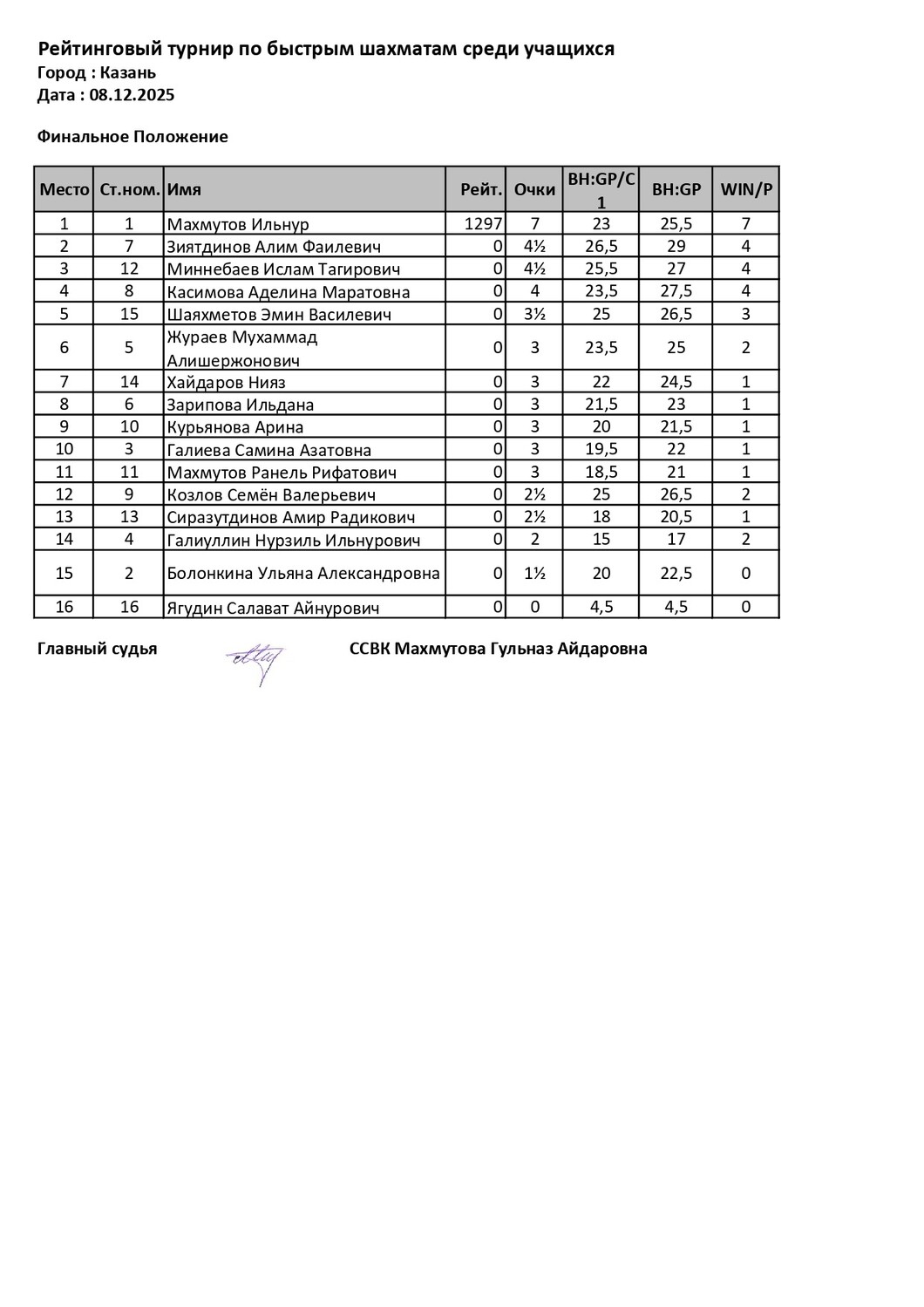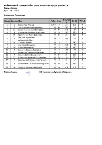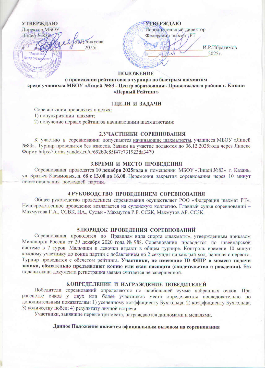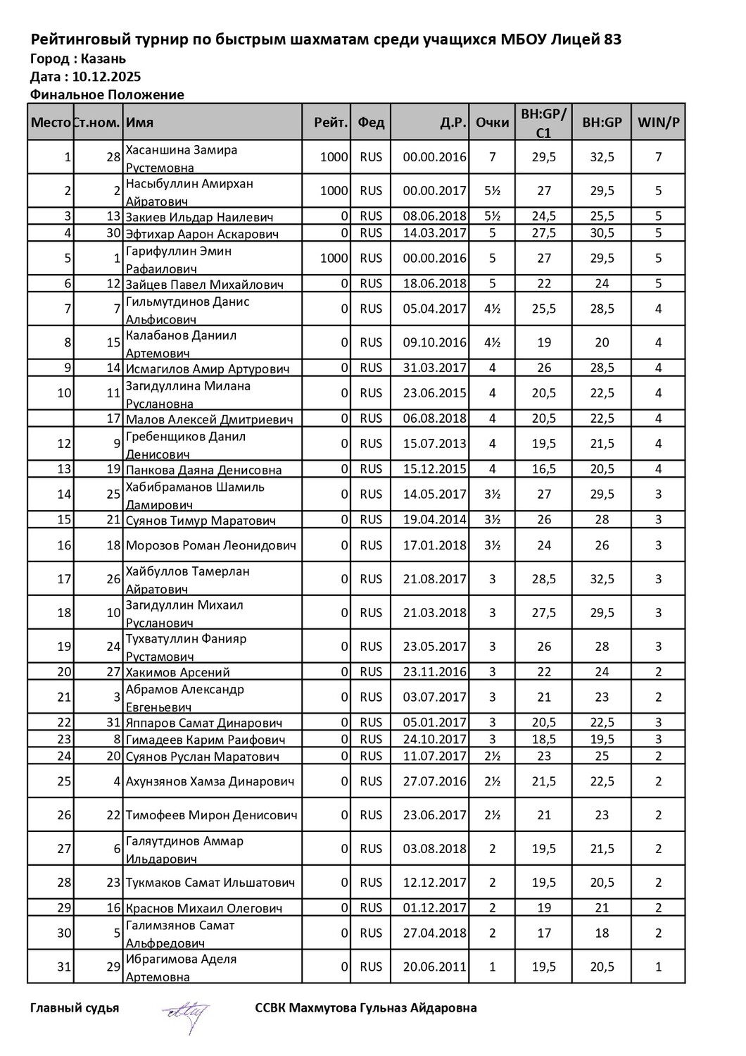8 и 10 декабря 2025 года в МБОУ «Лицей №83 - Центр образования» Приволжского района г. Казани состоялись рейтинговые турниры по быстрым шахматам, организованные Федерацией шахмат РТ. В соревновании приняли участие 47 учеников 83 Лицея.
